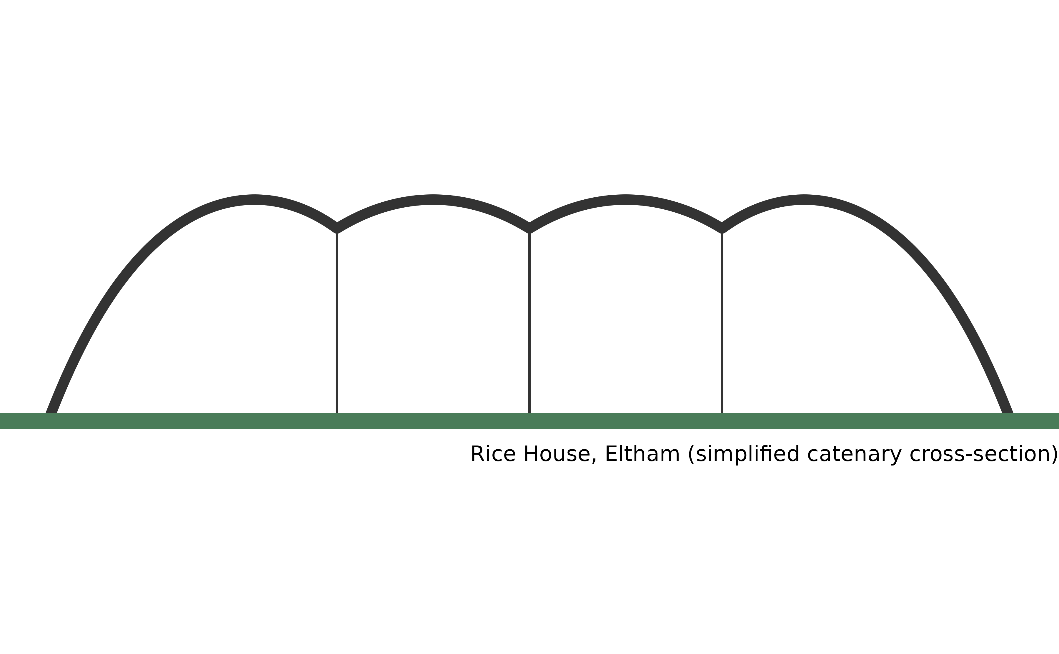 A real-world application is the Rice House in Eltham, whose distinctive roofline consists of shallow catenary arched spans rising above vertical columns. The sketch below reconstructs its simplified cross-section: