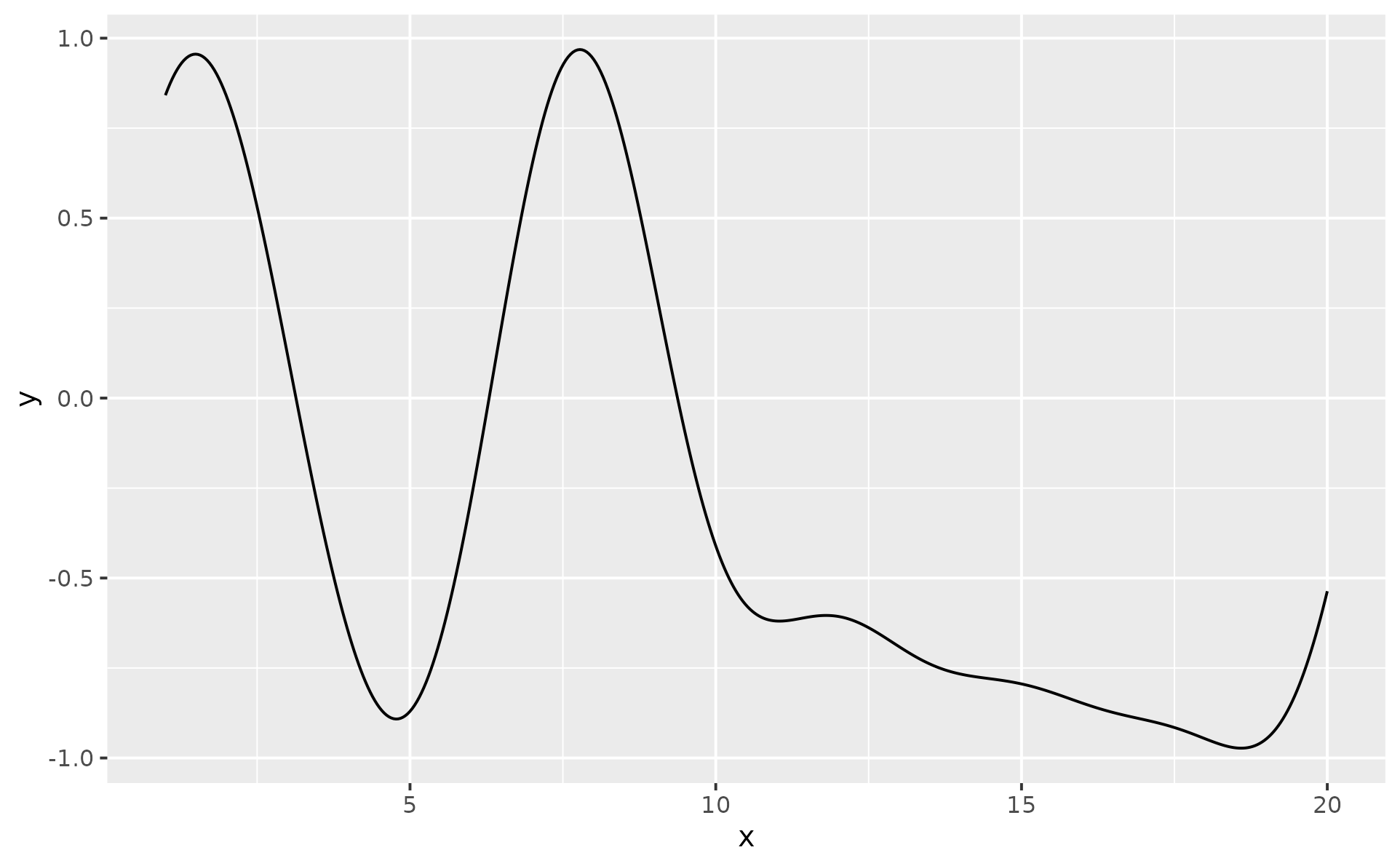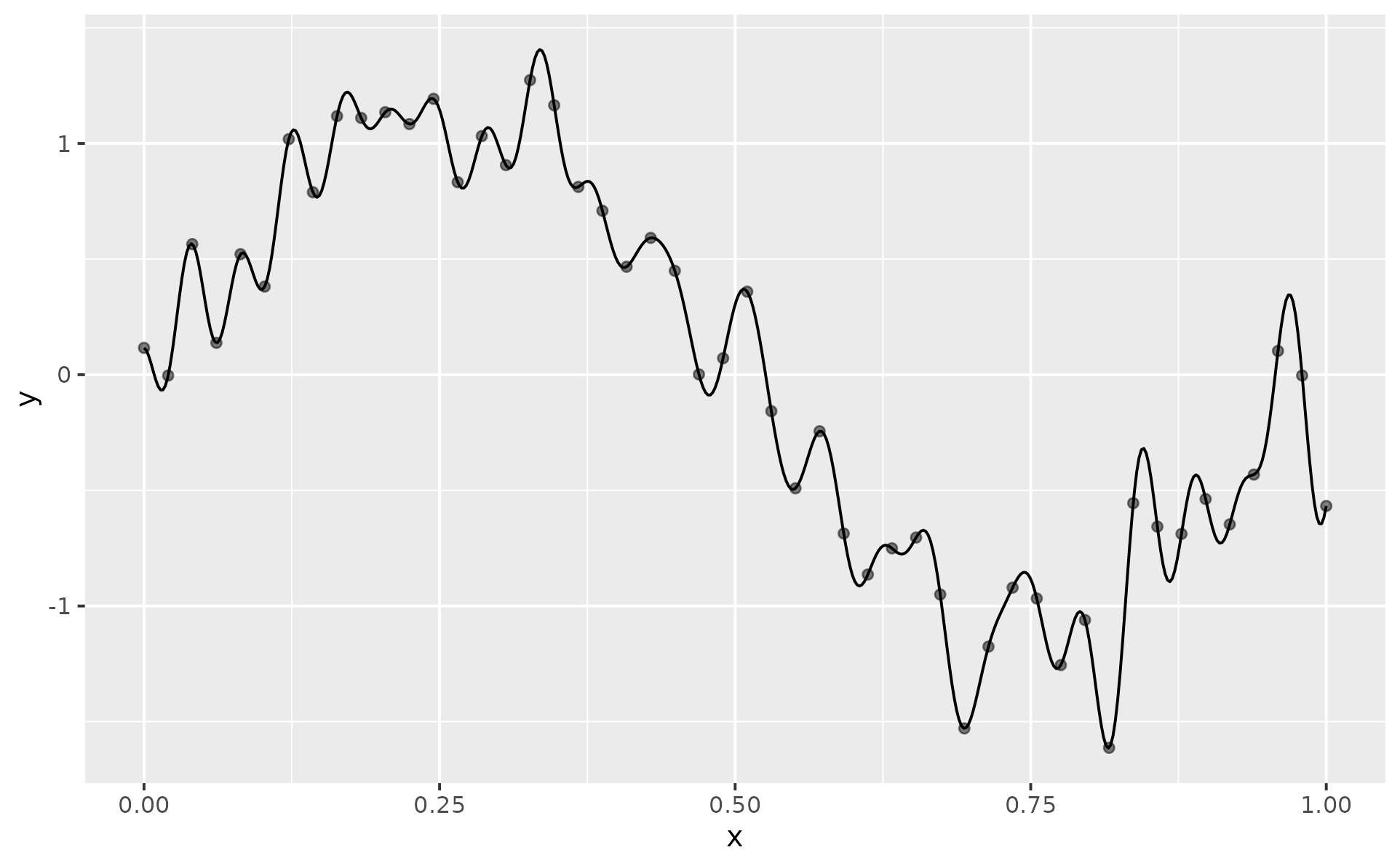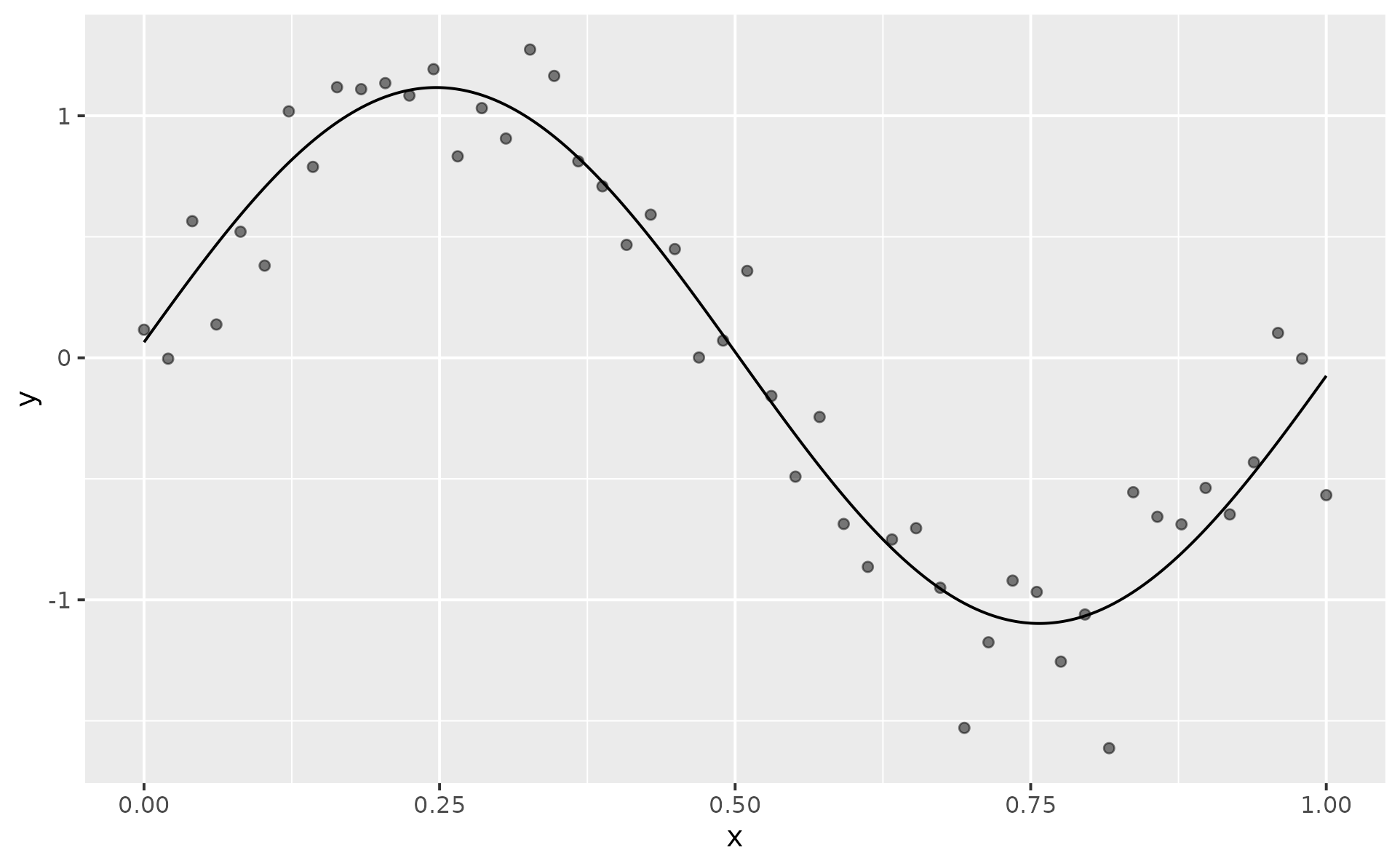y = sin(x) + x * 0.3 + rnorm(n, sd = 0.15)
